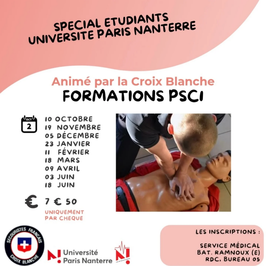 Vous souhaitez vous former aux gestes de premiers secours ? Le service santé et étudiante, en partenariat avec la Croix Blanche organisent des formations PSC1 diplômantes, tout au long de l'année.