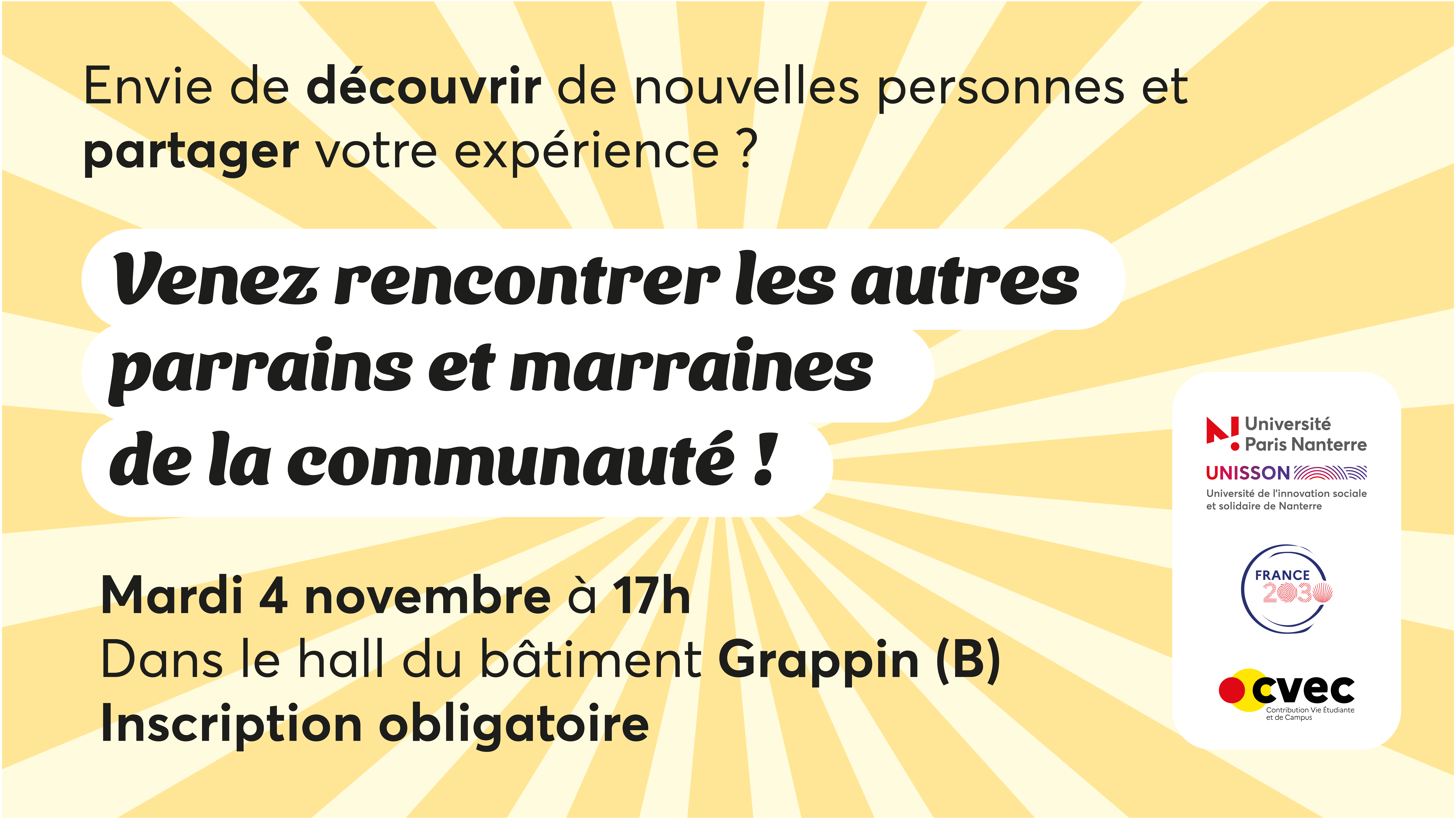 Aussi, si vous étiez présent lors de la rencontre du 30 septembre, merci de laisser votre place aux parrains et marraines n'ayant pas encore pu participer au précédent événement parrainage.
