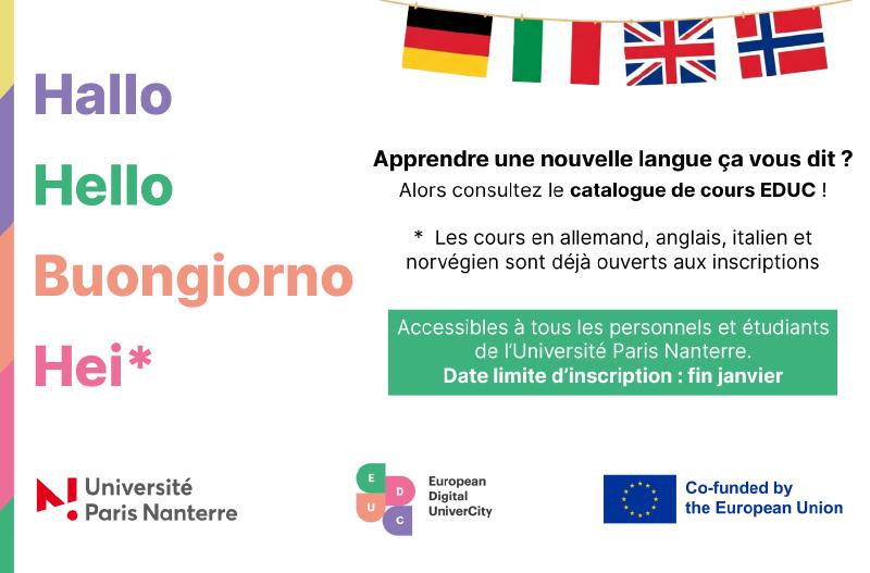 Ces cours sont accessibles à tous les étudiants et personnels de l’Université Paris Nanterre. Les inscriptions s’effectuent directement via le catalogue de cours EDUC.