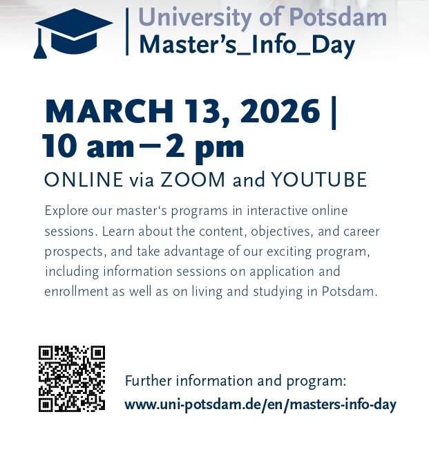 Vous envisagez un Master à l'étranger ? Notre partenaire allemand au sein de l'alliance EDUC, l’Université de Potsdam, organise sa première journée d'information virtuelle le 13 mars 2026. Découvrez une large offre de formations en anglais et en allemand depuis chez vous.